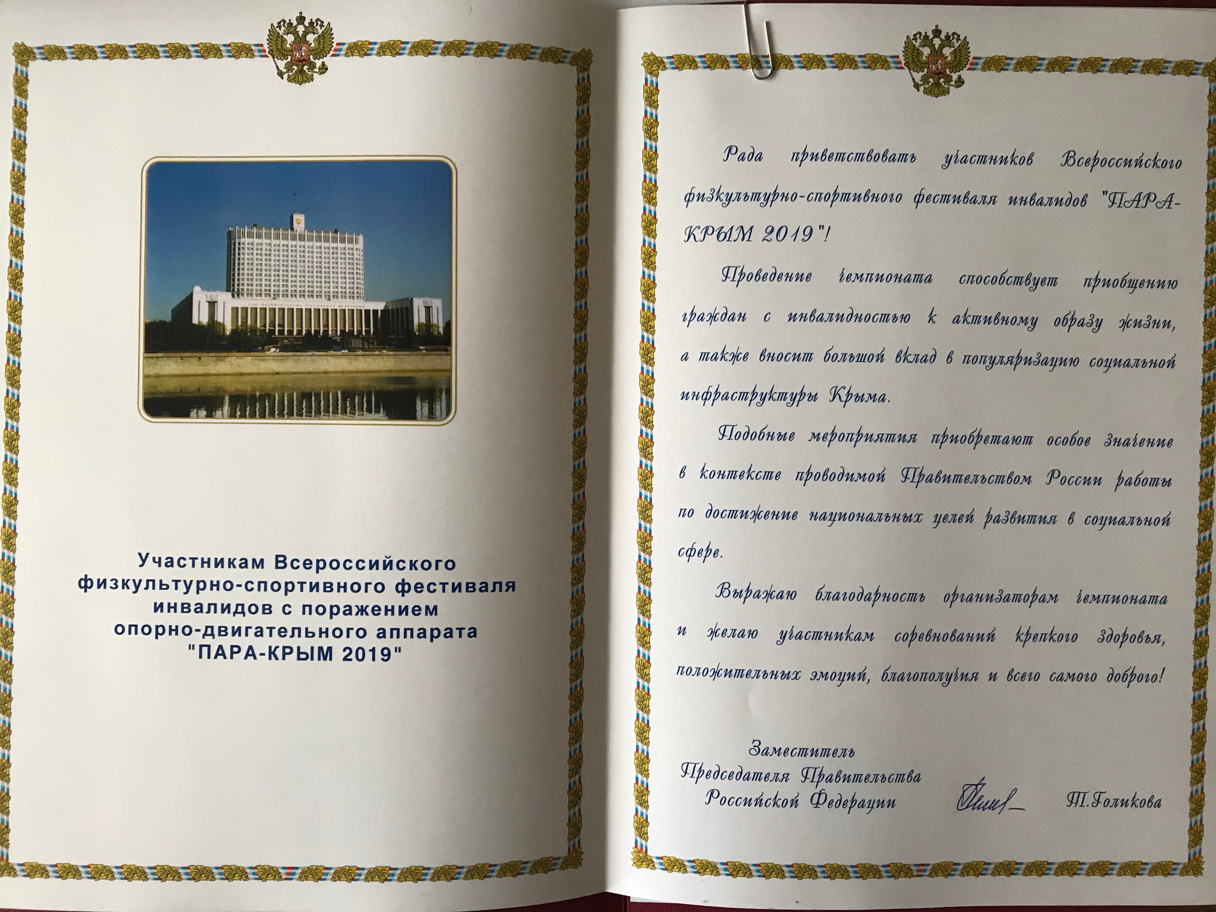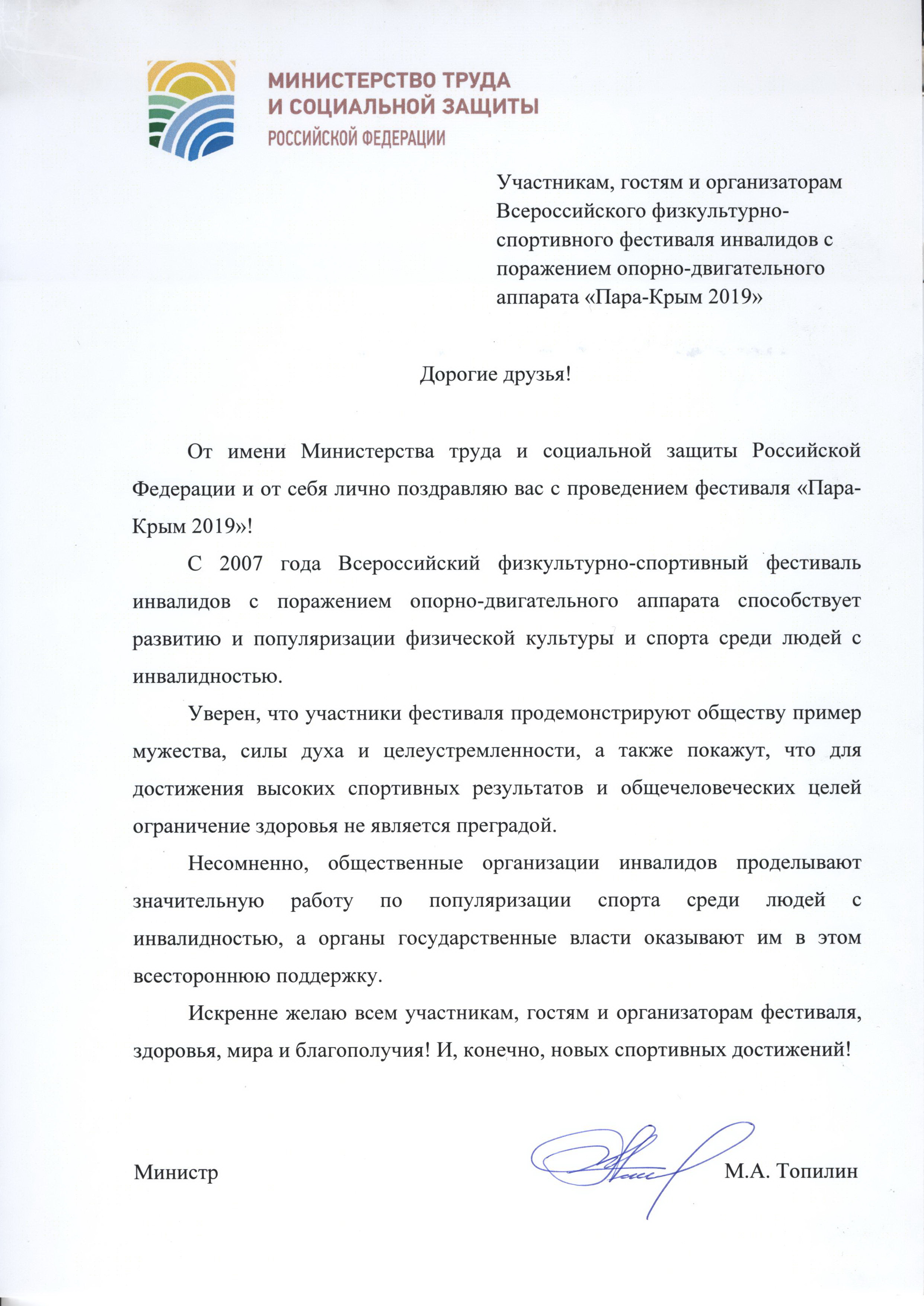 Приветствия участникам фестиваля направили: Заместитель Председателя Правительства Российской Федерации Голикова Т.А.; Советник Президента Российской Федерации Левицкая А.Ю.; Министр труда и соцзащиты Российской Федерации Топилин М.А.; Министр спорта Российской Федерации Колобков П.А.; Президент Паралимпийского комитета России Лукин В.П.; Глава Республики Крым, Председатель Совета министров Республики Крым Аксенов С.В.; Глава Муниципального образования – Председатель Евпаторийского городского совета Республики Крым Харитоненко О.В.; Министерство спорта Республики Крым
